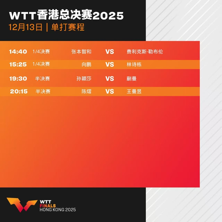 12月12日,WTT香港总决赛迎来多场焦点对决,国乒军团表现亮眼。其中女单赛场尤为强势,孙颖莎、陈熠、蒯曼、王曼昱携手晋级四强,提前包揽冠亚军。12月13日将展开混双半决赛、女单半决赛及混双决赛,孙颖莎面临一日三赛的“极限操作”,双线作战的体能分配与状态切换成为严峻挑战。